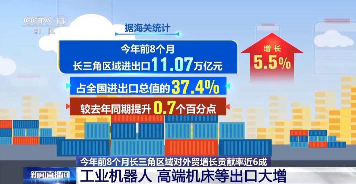 海关总署统计分析司司长 吕大良:近年来,长三角区域创新能力、发展能级不断提升,为外贸高质量发展注入强劲动能。今年前8个月,长三角区域进出口超过11万亿元,对全国进出口增长的贡献率达到58%。