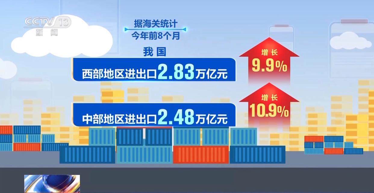 据海关统计,今年前8个月,我国西部地区进出口2.83万亿元,增长9.9%。中部地区进出口2.48万亿元,增长10.9%。