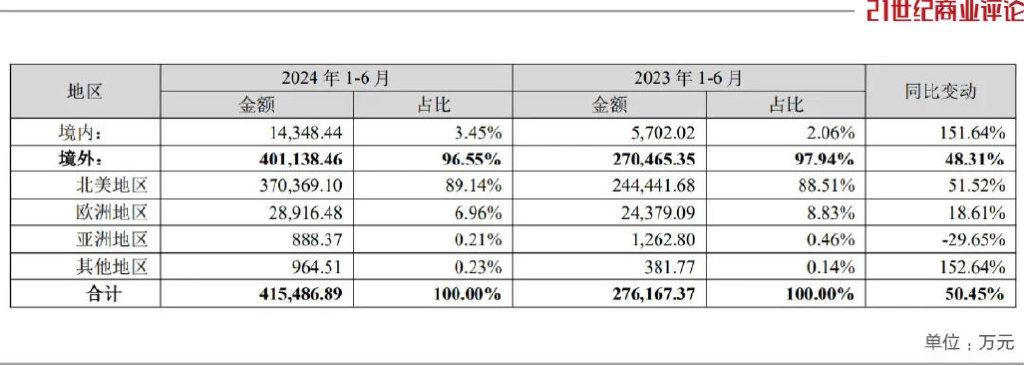 据中报披露,1-6月,北美市场为赛维贡献了九成的销售额,其次是欧洲地区,占比约6.96%,亚洲地区居第三位,仅占0.21%。