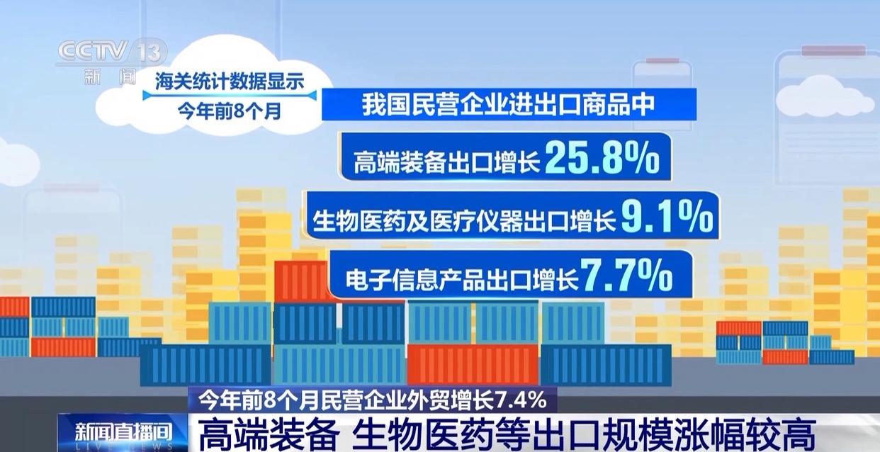 海关统计数据显示,今年前8个月,我国民营企业进出口商品中,高端装备、生物医药及医疗仪器、电子信息产品出口分别增长25.8%、9.1%、7.7%。