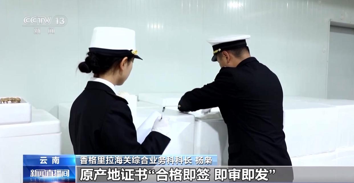 香格里拉海关综合业务科科长 杨枭:针对出口鲜活易腐农食产品,推广运用“7×24小时”属地预约查检模式,实现植物检疫证书、原产地证书“合格即签、即审即发”。今年以来,迪庆州出口食用菌及其制品货值1917.7万元,同比增长364.5%。